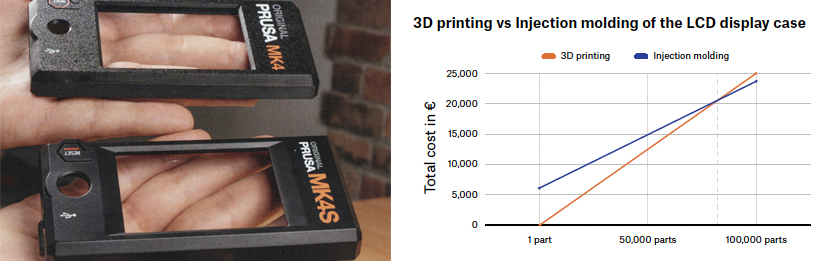 Basándonos en su análisis sobre la producción de su modelo MK4S, ofrecemos las ventajas y desventajas que ellos mismos publicaron en su revista anual, y un interesante gráfico sobre el punto de inflexión exacto entre ambas tecnologías.